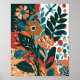Ein lebendiges und abstraktes Gemälde mit einer Vielzahl von stilisierten abstrakten Formen. Das Kunstwerk ist voll mit fett gesättigten Farben, darunter dunkelgrüne, orangefarbene, gelbe, grüne und blaue Farbtöne. Die Formen haben große, übertriebene Blütenblätter mit komplizierten Mustern, während die Streifen in verschiedenen Formen und Größen dargestellt sind, wodurch ein üppiger, vielschichtiger Effekt entsteht. Der Hintergrund umfasst eine Mischung aus kräftigen Farben, Farbenwaschs und spielerischen Polka-Punkten, die Tiefe und Kontrast erhöhen. Der Gesamtstil ist modern, ausdrucksstark und voller Energie, mit einem starken Schwerpunkt auf Farbe und Form, flacher Vektorgrafik, Graffiti, Acryl, Aquarellfarbe, weißer Libelle, Briefmarke-Effekt-Collage. Rote Farbtöne, Paisleymuster, weiße Libelle in der Ecke und eine niedliche Katze