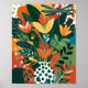 Ein lebendiges und abstraktes Gemälde mit einer Vielzahl von stilisierten abstrakten Formen. Das Kunstwerk ist voll mit fett gesättigten Farben, darunter dunkelgrüne, orangefarbene, gelbe, grüne und blaue Farbtöne. Die Formen haben große, übertriebene Blütenblätter mit komplizierten Mustern, während die Streifen in verschiedenen Formen und Größen dargestellt sind, wodurch ein üppiger, vielschichtiger Effekt entsteht. Der Hintergrund umfasst eine Mischung aus kräftigen Farben, Farbenwaschs und spielerischen Polka-Punkten, die Tiefe und Kontrast erhöhen. Der Gesamtstil ist modern, ausdrucksstark und voller Energie, mit einem starken Schwerpunkt auf Farbe und Form, flacher Vektorgrafik, Graffiti, Acryl, Aquarellfarbe, weißer Libelle, Briefmarke-Effekt-Collage. Rote Farbtöne, Paisleymuster, weiße Libelle in der Ecke und eine niedliche Katze