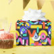 Farbiges abstraktes Muster mit Liebe in Wort, Augen, Tränen, Farbblöcken. Musterbeispiel mit hellen Farbblockierungen. Trendfarbenes geometrisches Muster aus Pop mit fetten Formen auf schwarz. Farbenfrohe Pop Kunstmuster mit auffallenden Formen. Abstrakte Farbmuster mit funky geometrischen Formen. Kunst, Muster, Hintergrund, abstrakt, Textur, Dekoration, Papier, Mode, Illustration, Party, Marketing, kreativ, nahtlos, geometrisch, Hipster, Stoff, bunt, modern, Formen, Elemente