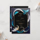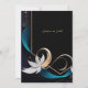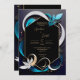 Dieses Bild zeichnet sich durch ein elegantes und modernes abstraktes Design aus. Das Design zentriert sich um einen dunklen sechseckigen Rahmen mit einer goldenen Kontur, Set vor einem dunklen Hintergrund. Blühende, bandähnliche Elemente in aquamarinen, weißen und goldenen Farbtönen umkreisen den Rahmen anmutig und verleihen ihm ein Gefühl von Bewegung und Eleganz. Eine weiße Blume mit goldenen Akzenten fügt der ansonsten abstrakten Komposition eine Touch von natürlicher Schönheit hinzu. Das Gesamtbild ist elegant, mit zeitgenössischer Ästhetik, die Bio und geometrische Elemente kombiniert. Dieses Design wäre gut geeignet für eine stilvolle und moderne Hochzeit, möglicherweise mit einem Farbschema, das sich auf dunkle Farbtöne, aquamarin und Gold konzentriert. Personalisieren Sie den Text bezüglich der Namen und Details der Hochzeit. Sie können die Karte auf Ihr mobiles Gerät oder Ihren Computer herunterladen.