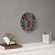 Diese Wanduhr hat ein kunstvolles Deko-Design von Ovalen mit abstrakten Designs in jedem von ihnen in Retrofarben Rosa und Blau.