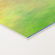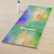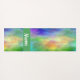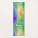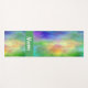 Maßgeschneiderte Yoga-Matte in einem farbenfrohen, gelben, grünen, blauen und rosa Plasma-Cloud-Design, mit einem grünen Band, über einem Ende, mit individuellem weißen Text. Das gleiche Design ist sowohl auf der Vorder- als auch auf der Rückseite der Matte zu sehen.