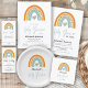 Eine schöne Babydusche, die perfekt für einen kleinen Jungen ist. Diese Babyduscheinladung ist ein Set für eine Dusche mit der Post. Das Design zeichnet sich durch einen niedlichen Regenbogen in Orange-, Gold-, Grün- und Blautönen aus.