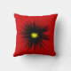 Dieses Kopfkissen zeichnet sich durch ein dramatisch abstraktes Design einer schwarzen Blume mit einem goldgelben Zentrum auf einem knarbigen roten Hintergrund aus. Das Bild wird auf der Rückseite wiederholt.