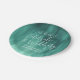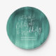 Smaragdgrüne moderne abstrakte Kunst bemalt Hochzeitspapier Teller. Typografischer Text liest Essen, trinken & feiern die Hochzeit von dann fügen Sie Ihre eigenen Namen unter. Eine personalisierte Ergänzung zu Ihrem Hochzeitsbuffet oder Ihren Party-Tischen. Andere passende Elemente und Farben sind in diesem Design verfügbar. © Original wassercolor art and design by Sarah Trett for www.mylittleedenweddings.com