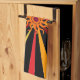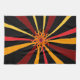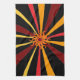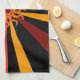 Dieses Küchentuch weist ein abstraktes geometrisches Muster der Sonne auf und strahlt in Rot-, Gelb-, Gold-, Orange- und Braun-Set auf einem schwarzen Hintergrund.