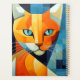 Lassen Sie sich diese fesselnde kubistische Illustration einer atemberaubenden orangefarbenen Katze in fett gemalten, steinernen Linien vor einem beruhigenden Hintergrund von blauen Grautönen zeigen. Dieses Rendering verbindet künstlerische Innovation mit feliner Eleganz. Was diese Kunstwerke auszeichnet, sind die faszinierenden blauen Augen der Katze, die das Wesen ihres Blicks auf eine wirklich einzigartige Weise erfassen. Die sorgfältige Aufnahme von weißen Whiskys fügt eine delikate Touch hinzu und unterstreicht die faszinierenden Details inmitten abstrakter Schönheit. Der Kontrast zwischen den warmen Orangentönen der Katze und der coolen Blues und den Grauen des Hintergrunds schafft eine visuell auffällige Komposition.