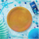 Abstrakte wirbelfarbene Farben in orange Gelb und Pappteller