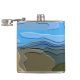 Ein helles, farbenprächtiges abstraktes Design mit Blick auf die Berge, mit blauem Himmel, Felsen und Bäumen.