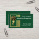 Ein ganz dunkelgrünes Cover mit einem abstrakten Gebäude-Blitzableiter und einem goldenen Blitz im Inneren. Die Quelle des Blitzes ist aus einem goldenen Glühbirnen Logo, das Sie verwenden können. An der oberen Ecke befindet sich neben dem Firmennamen "Elektroservice" und den Kontaktdaten Ihr Prestigename. Oben auf der Rückseite befindet sich das goldene Logo, gefolgt von den Kontaktdaten und einer Slogan-Beschriftung. Eine großartige Karte für Elektriker.