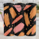 Dieses Bild zeichnet sich durch ein nahtloses Muster aus abstrakten Pinselstrichen und zerstreuten Glitzer-Partikeln auf einem schwarzen Hintergrund aus. Die Pinselstriche sind vorwiegend in Orange-, Korallen- und Rosatönen gehalten, mit sichtbarer Textur und geröteten Kanten, was auf ein handgemaltes Ambiente hindeutet. Kleine, unregelmäßige Punkte Glitzer in Komplementärfarben werden durch das gesamte Design gestreut, wodurch ein funkelnder Effekt entsteht.