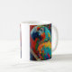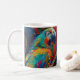 Kaffee Tasse für diejenigen, die Papageien mögen. Dies ist eine hübsche Ai-Illustration in einem Ölgemälde-Stil eines farbenfrohen Blau-, Rot- und Gelbpapagepapagei.
