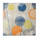 Abstraktes farbiges Polka-Punktmuster. Große, blaue Textur, orangefarbene Erbsen und schwarze, kleine Punkte auf beigem Hintergrund.