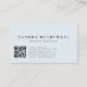 Diese elegante, moderne Visitenkarte besticht durch eine abstrakte Aquarellmalerei in sanftem Blau. Personalisieren Sie es mit Ihrem Namen in fett, grob, grob kochgrau Serif Schriftart und Ihre Geschäftsinformationen in serifenem Schriftart. Auf der Rückseite der Karte befindet sich karkohlegrauer Text auf einem soliden, weichen, blauen Hintergrund, sowie ein QR-Code, der Kunden auf Ihre Business-Website leitet.