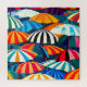 Eine fröhliche Darstellung von sonnengetränkten Tagen und Entspannung am Meer mit bunten gestreiften Sonnenschirmen.