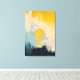 Dieses minimalistische abstrakte Kunstwerk fängt die stille Schönheit eines Sonnenuntergangs durch weiche Texturen und eine raffinierte, moderne Komposition ein. Ein warmer goldener Kreis schwebt sanft über geschichteten Formen, was darauf hindeutet, dass die Sonne zum Horizont hinabsinkt. Gedämpfte Blautöne, tiefe Charcoal-Töne und cremige Weißtöne verschmelzen nahtlos darunter und erzeugen einen friedlichen Kontrast zum leuchtend gelben Himmel darüber.