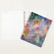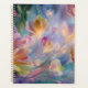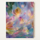 Das Bild zeigt eine abstrakte Blumenkomposition mit einer traumhaften Qualität. Große stilisierte Blumen in Lila-, Gelb- und Rosatönen dominieren den Vordergrund, ihre Blütenblätter erscheinen durchsichtig und leuchtend. Der Hintergrund ist eine wirbelnde Mischung aus Blau-, Grün- und Lilatönen, die eine weiche, ätherische Atmosphäre schafft. Kleinere Blumenelemente mit zarten Stielen reichen nach oben und verleihen der Szene Tiefe.