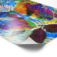 Ein abstrakter blauer, orangefarbener, grüner und lila Schmetterling vor einem limiengrünen und blauen botanischen Hintergrund, gerahmt von dunkelmaronen Blätter.