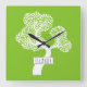 Abstrakter weißer Kreis Baum und Name Kalkgrün Quadrat Uhr ohne Zahlen. Ein hübscher abstrakter Baum aus Kreisen anstelle von Blätter schmückt diese Wanduhr. Es enthält auch einen Rahmen mit personalisiertem Namen.
