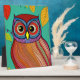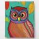 Niedliche rote, blaue, lila und braune Eule und Blätter volkstümliche KI Kunst.