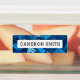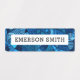Wasserdichte Eigenschaftenetiketten mit individualisierbarem Namen auf einem abstrakten blauen Muster. Ideal für die Kennzeichnung Ihrer persönlichen Sachen