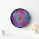 Uhr mit abstraktem Blumendesign in heißen Rosa und Blau mit schwarzem Holzrahmen. Die Zahlen sind weiß.
