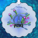 Diese hängende Schmuckkarte hat ein blaues Friedenszeichen mit dem Text Peace in einem abstrakten Design von rosa blau, grüne Rollen und Sterne auf blauem Hintergrund. Passen Sie Ihren Text mit den Vorlagen auf der Vorder- und Rückseite an.