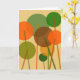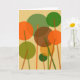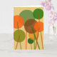 Ein abstraktes geometrisches, modernes Blumendesign mit runden Blume an Stielen in Orange, Grün und Braun.
