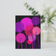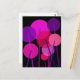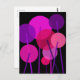 Ein abstraktes geometrisches, modernes, blumengeschmücktes Design runder Blume auf Stielen in Rosa, lila und Rot vor schwarzem Hintergrund.