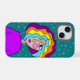 Buntes, helles, abstraktes Design eines stilisierten Mädchens mit gestreiftem Haar, mit einem Hintergrund von Sternen.