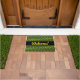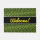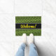 Dieses Türmatten-Ausrüstungsbeschreibungen ein abstraktes Muster mit Flüssigkeit ähnlichen Splotch- oder Blobformen, farbige verschiedene Schatten von hellem und von dunkelgrünem. Es kennzeichnet auch die freundliche Mitteilung "Willkommen!" auf der Front im gelben Skript ähnlichen Text.