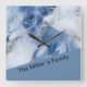 Eine quadratische Wanduhr in dunkelblauen, weißen und hellblauen Marmorfarben mit flüssigem Marmor. Das Design ist ein traumhaftes romantisches und elegantes Design mit Gold- und Silberspuren wie den Küstenbrise-Gläsern. Es sieht aus wie eine abstrakte Marmorsteinstruktur und eine flüssige Lava gleichzeitig. Sie können die Wanduhr mit Ihrer persönlichen Touch, wie Ihren Namen oder Monogramme, anpassen. Dieses Design passt perfekt in die Zuhause und lässt die Brise in Ihr Zimmer kommen.