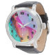 Eine Uhr mit extravagantem künstlerisch abstraktem Design. Wasserfarbenmalerei mit Farbmischungen und -mischungen, die ein fließendes Marmormuster erzeugen.