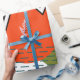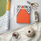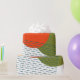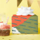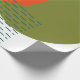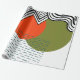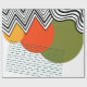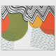 Dieses Verpackungspapier hat ein modernes Design von kurvigen und zigzackigen Linien in schwarz, Kreise in gelb, orange und grün und ein Rechteck aus gestrichelten aquamarinen Linien.