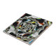 Diese Keramik-Kachel weist eine abstrakte, psychedelische Spirale-Fraktal-Kunst in Schwarz-Weiß mit gelben, orangen, blauen und grünen Akzenten auf.