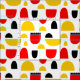 Originelles, nahtloses abstraktes Muster aus fett gezogenen, halb ovalen und halbkreisförmigen Formen, rot, gelb und schwarz auf weißem/transparentem Hintergrund. Dieses Musterdesign verwendet ein hochauflösendes Muster-Fliesenbild, das es ermöglicht, das Muster zu vergrößern oder zu verkleinern.