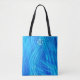Lichtlinien in himmelblau scheinen sich über die Oberfläche der Tasche zu streuen und bilden ein interessantes abstraktes Design. Ihr Monogramm ist auf einem Kreis-Banner oben in passendem Blau. Die Rückseite des Beutels hat das gleiche Muster, aber nicht das Kreissymbol oder Monogramm. Hell, farbenfroh und attraktiv in jeder Jahreszeit.