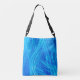 Lichtlinien in himmelblau scheinen sich über die Oberfläche der Tasche zu streuen und bilden ein interessantes abstraktes Design. Ihr Monogramm ist auf einem Kreis-Banner oben in passendem Blau. Die Rückseite des Beutels hat das gleiche Muster, aber nicht das Kreissymbol oder Monogramm. Hell, farbenfroh und attraktiv in jeder Jahreszeit.