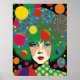 Farbenfrohe abstrakte Darstellung einer Frau mit einem altmodischen Haar, umgeben von Punkten.