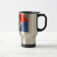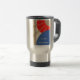 Das Travel Mug hat ein abstraktes Design in den Farben Creme, Rot, Blau und ein tan Digital-Design mit Strahlen. Sie können die Wörter auf der Tasse ändern.