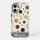 Ein elegantes Muster mit verschiedenen Kreisen und botanischen Motiven in einer sanften Farbpalette aus Beige, Braun, Schwarz und Blau. Dieses minimalistische Design erinnert an eine ruhige Waldatmosphäre.