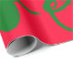 Dieses festliche Verpackungspapier zeigt gekrümmte Linien und Formen in Grün auf eine rote Oberfläche.
