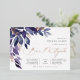 Elegant gender neutral bar mitzvah invitation features blue and purple watercolor leaves and foliage cascading from the upper left corner, embellished with rose gold foil accents. Personalize with your temple ceremony and celebration details aligned at the right.