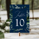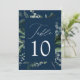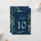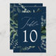 Elegant, botanical wedding table cards featuring the table number nestled in a rectangular frame surrounded by eucalyptus, ferns, and other rich greenery with a navy background. Personalize the number for each table card and add it to your cart. The 5x7 table numbers were designed to coordinate with our Abundant Greenery wedding collection.