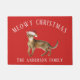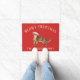Adorable Weihnachtsmatte mit einer abessinischen Katze, die eine Weihnachtsmannmütze auf festlichem rotem Hintergrund trägt.