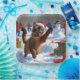 Eine herzliche Ferienillustrierung mit einer fröhlichen Katze, die im Schnee spielt, eine Weihnachtsmannmütze trägt und von bunten Geschenkboxen umgeben ist. Im Hintergrund bauen die Kinder neben einem schneebedeckten Weihnachtsbaum einen Schneemann und schaffen so ein fröhliches Winterwunderland. Ideal, um Feiertagssjubeln zu verbreiten und den Zauber von Weihnachten zu erfassen.