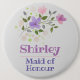 Einführung in die Trauzeugin - ein Button-Abzeichen mit dem Namen und einer Blumendarstellung. Abzeichen zur Identifizierung von Hochzeiten.