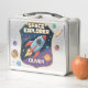 Dieses personalisierte Metal Lunch Box besticht durch ein kühnes und lebendiges Abzeichen. In der Mitte des Abzeichens befindet sich eine spielerische Cartoon-Rakete, die durch den Weltraum strömt und von Planeten umkreist wird.