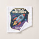 Dieses personalisierte Handtuch ist ein feines Abzeichen für Entdecker. In der Mitte des Abzeichens befindet sich eine spielerische Cartoon-Rakete, die durch den Weltraum strömt und von Planeten umkreist wird.