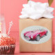 Dieses klebrige Etikett ist von meiner Aquarellmalerei eines Vintagen roten Sportwagens auf einer jüngsten Autoshow gedruckt.